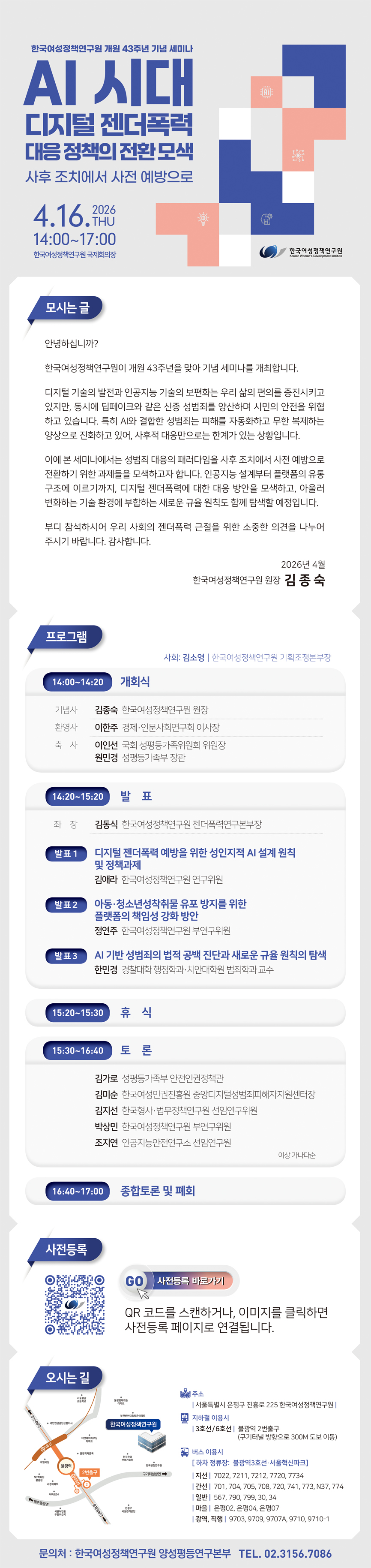 - 일시 및 장소: 2026. 4.16. (목) 14:00~17:00 / 한국여성정책연구원 국제회의장